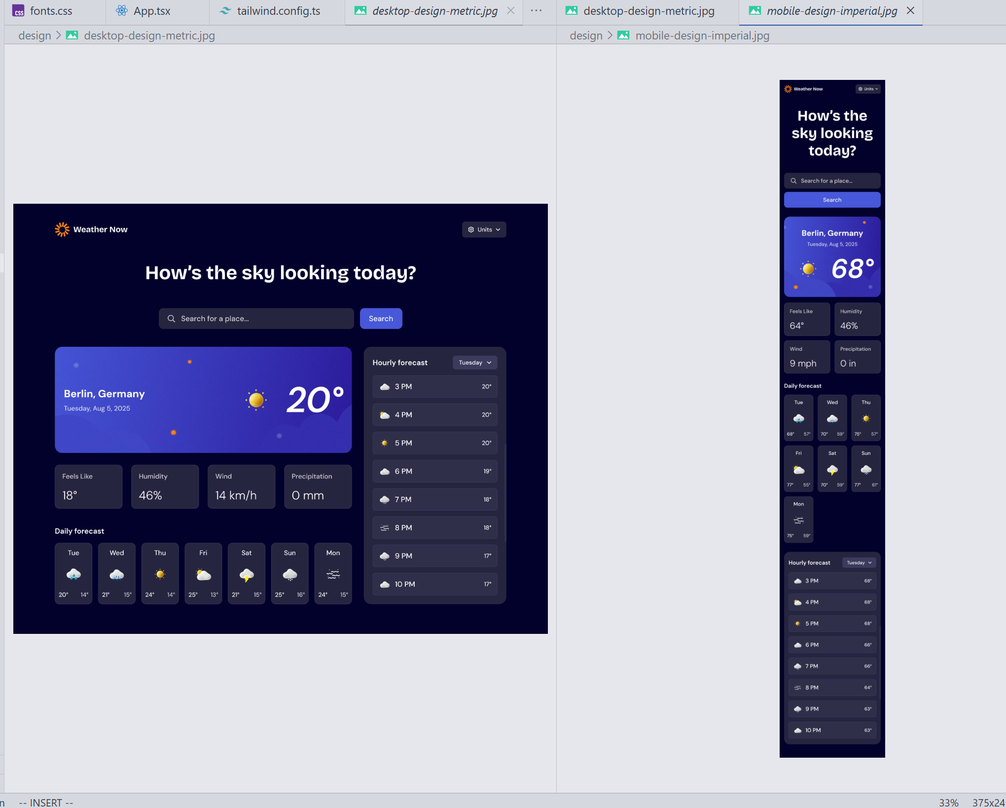 宽屏下,主要信息栏目分为两栏,左侧为主要卡片和日预报,右侧放置小时预报。而移动设计中则为单栏布局。要实现这样的效果,我们可以结合使用 Tailwind CSS 的响应式设计类和 Flexbox 布局。